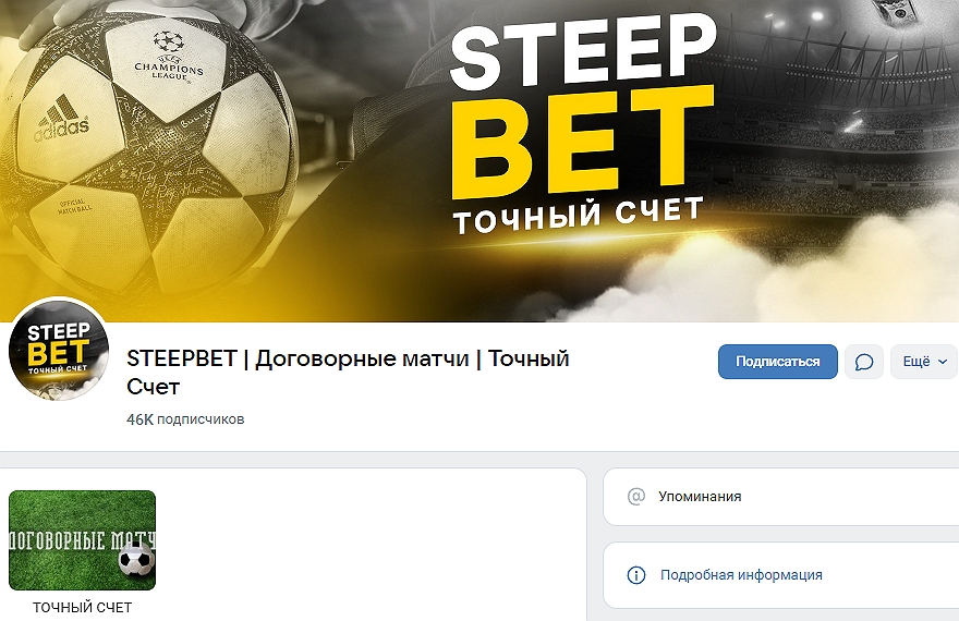 STEEPBET — ВК-сообщество Кирилла Катаева, раздающего аудитории «бесплатные точные счета» по наводкам неких «информаторов» со всей планеты. Фейк типичен для мошенничества, ведь озвучивающие подобные легенды лица не отвечают за правдивость слов, а просто хотят влачить вольготное существование за счет беттеров. Рассмотрим деятельность очередного индивида «на понтах», якобы готового спонсировать всех подряд в сообществе на адресе @steeepbet.