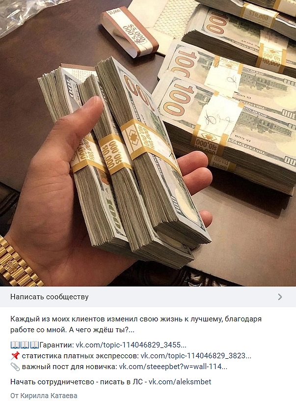 Вероятно, Кирилл Катаев сделал это с помощью увесистых пачек купюр, которыми светит перед потенциальными клиентами в группе @steeepbet. Удивительно, но «долларовый миллионер» почему-то не отдыхает «на Мальдивах», а прозябает ВКонтакте и просит у игроков рубли за невнятные экспрессы и ординары, и именно это — один из гарантированных маркеров планирования развода.