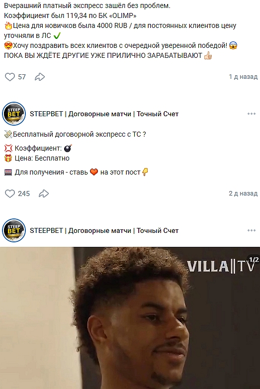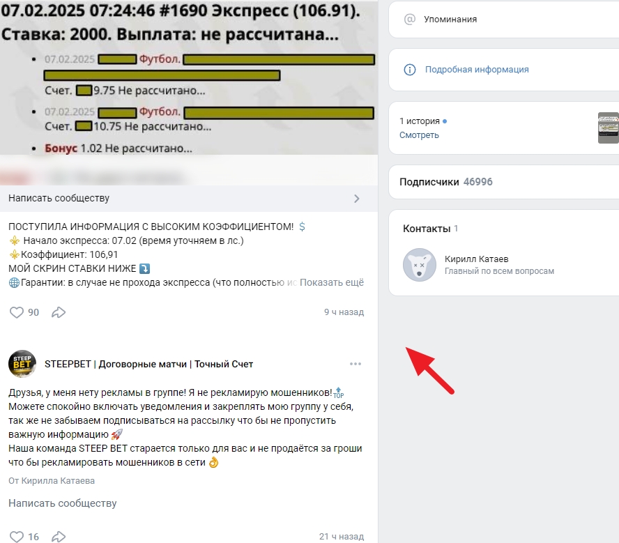 Как можно заигрывать экспресс в разных конторах с одним и тем же коэффициентом? Кирилл Катаев не объясняет, зато хорошо знает, как пользоваться доверием клиентов и бессовестно кидать на деньги. Достаточно изредка разбавлять посты на стене STEEPBET краткими новостями из мира футбола, а после имитации экспертности требовать от 4 до 5 тысяч рублей за «инсайд», чтобы затем присвоить деньги и удалить «мамонта» из контактов.