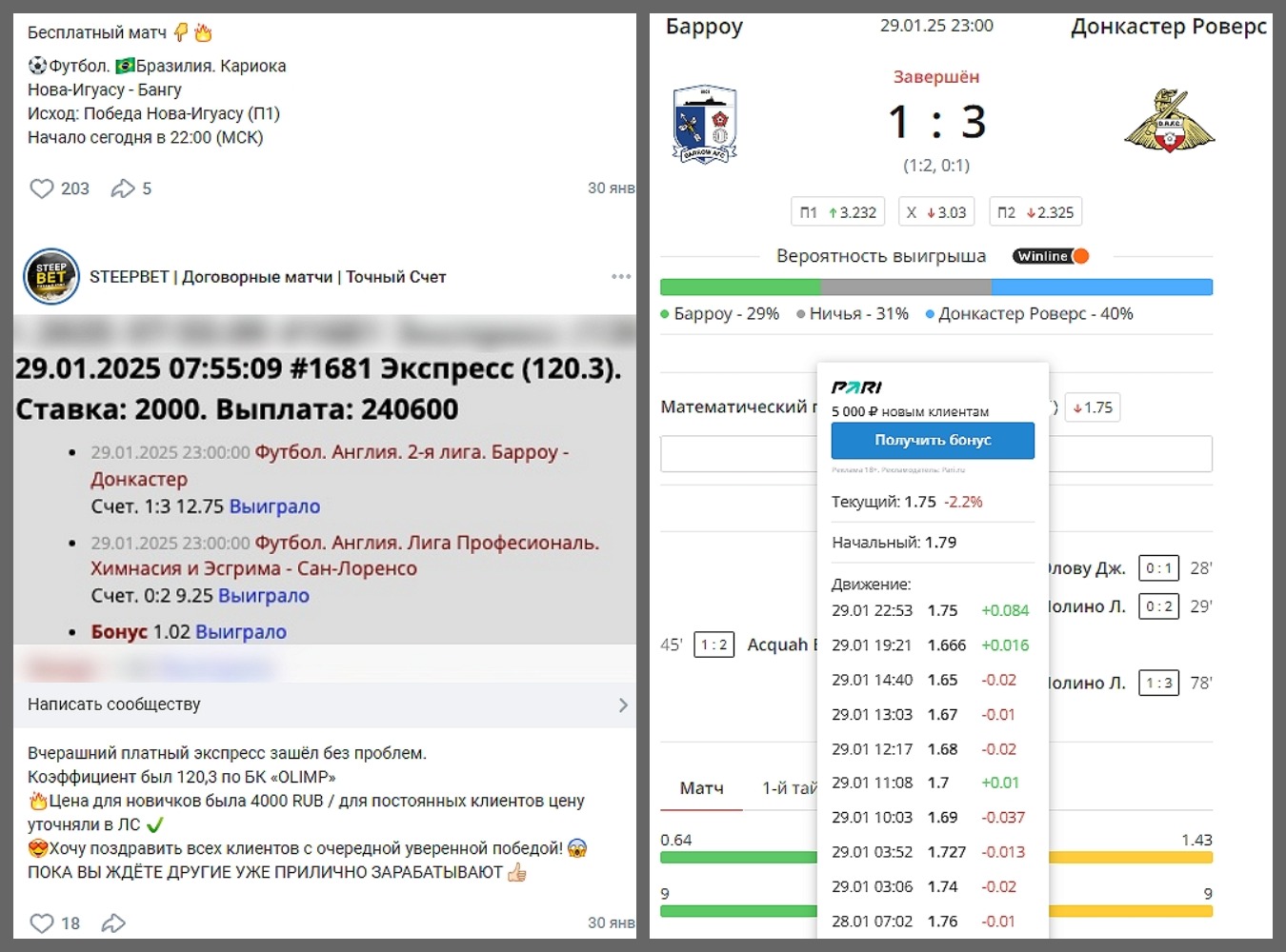 Открытий здесь также не предвидится — аноним выбирает случайные матчи по линии БК OlimpBet и описывает их «договорными», то есть команды по всему миру якобы «катают междусобойчики» эксклюзивно для какого-то анонима. Более того — у скамера есть «информаторы» в Иране, Италии да и вообще где угодно, ведь он «купил их всех».