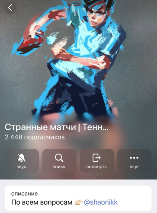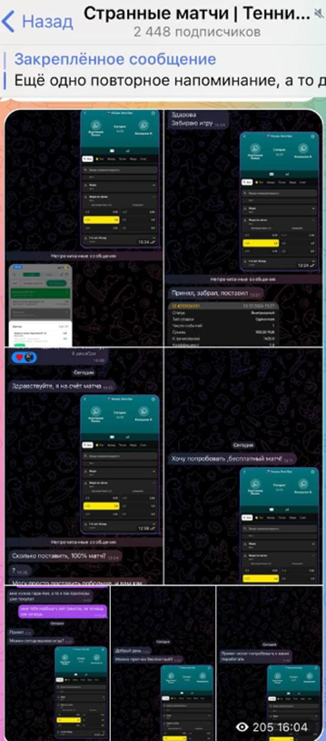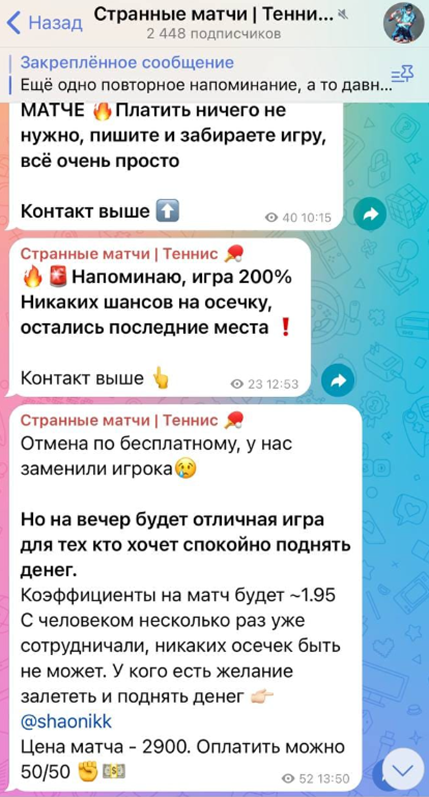 Весь контент в телеграмм-канале «Странные Матчи | Теннис» посвящен договорным играм между профессионалами по настольному теннису. В ленте иногда появляются посты с обещаем предоставить ставку на слитый матч бесплатно, но затем якобы происходит форс-мажор, а пользователям предлагают стопроцентный вариант заработать на пари. Котировки у платных прогнозов находятся на уровне 2.0.