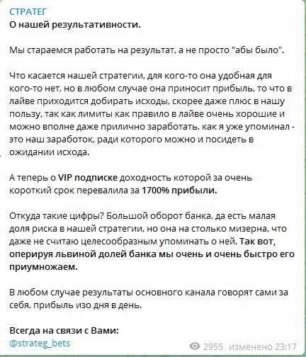 Регулярных отчетов по ставкам в ленте Стратег каппер не публикует, но он выкладывает серии выигрышных купонов. Сведения о минусовых пари отсутствуют. Верификации на сторонних ресурсах нет. Упоминается доходность до 1700%, но доказательств таких результатов не представлено. Верить в те цифры, которые публикует прогнозист не стоит, поскольку они являются голословными.