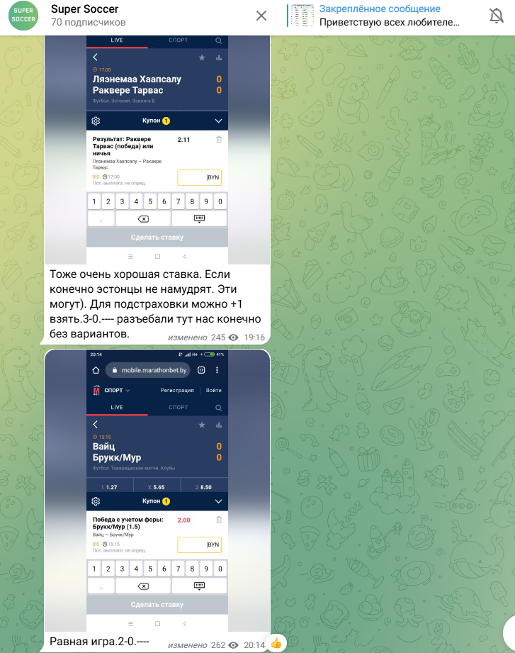 Этот же процесс можно отследить по постам в канале Super Soccer. Сам капер пишет о том, что последние месяцы ставок были для него неудачными, и он никак не мог выйти на хороший заработок. Это говорит о том, что, хоть статистика и положительная, гарантированно получить прибыль на сотрудничестве с прогнозистом не получится. Если в начале своей работы он и показывал хорошие результаты, то сейчас назвать их таковыми нельзя. Отметим, что коэффициенты капера средние: 1,5-2.
