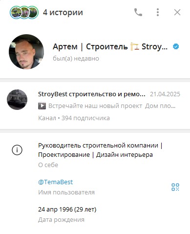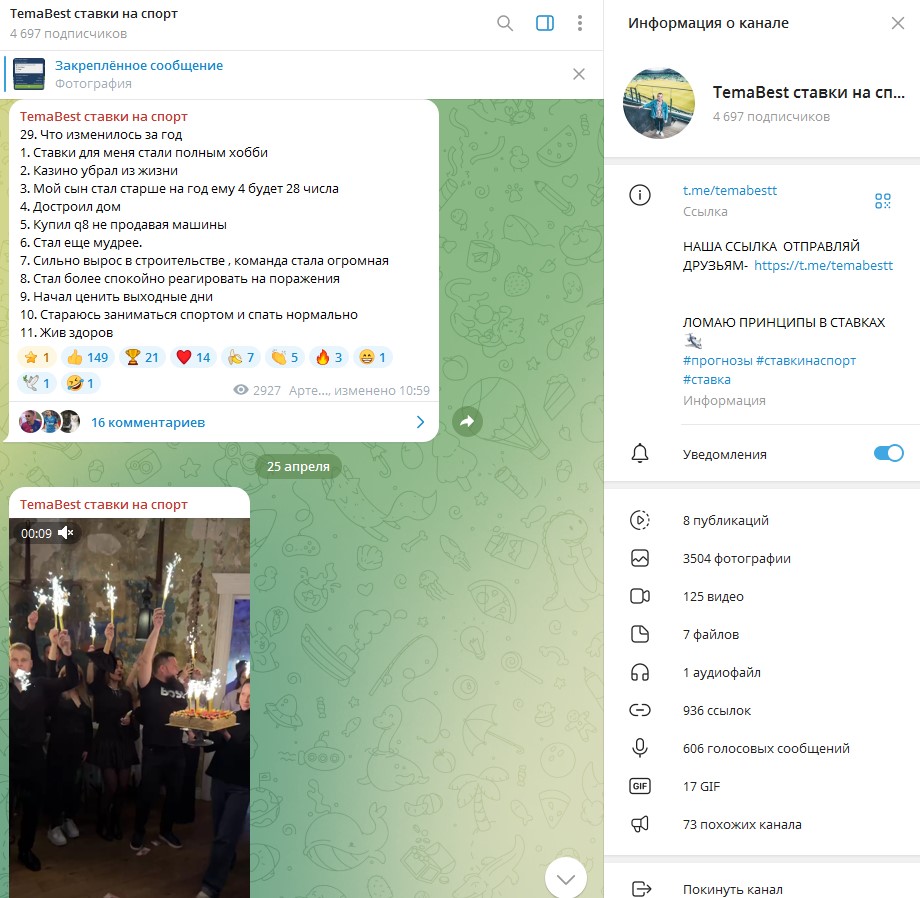 Молодому человеку 29 лет. Он не скрывает свое лицо и контакты, а также публикует видео ролики и собственные фотографии. Капер уже давно в ставках и якобы получает доход от беттинга. Кроме блога, автор ведет и реальный бизнес – Артем владеет строительной компанией. Канал фирмы активен по ссылке t me/stroybestt. Такая открытость – огромный положительный факт, ведь в Интернете многие прогнозисты ведут работу анонимно.