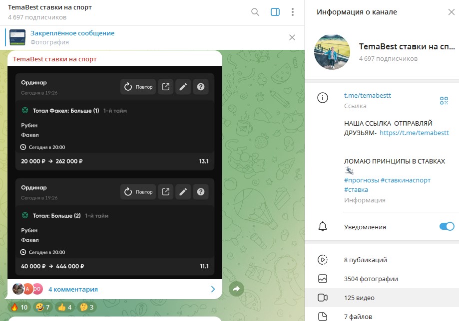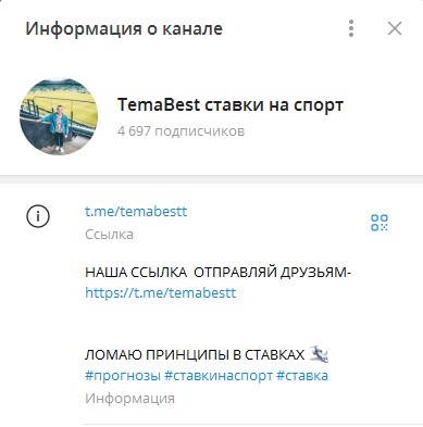 Предложений приобрести платные услуги в канале Tema Best ставки на спорт замечено не было.