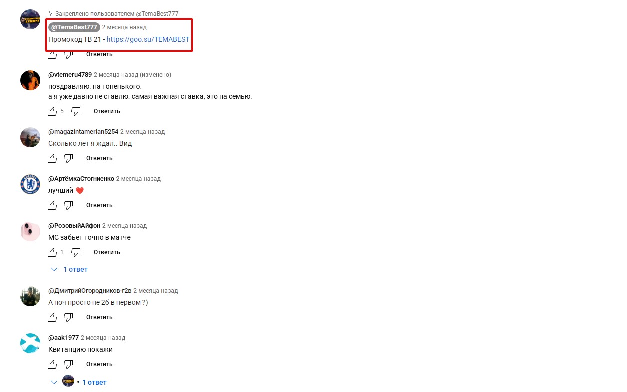 Под каждым видео Tema Best размещает рекламу БК с реферальной ссылкой. Контора не является лицензионной. Обычно пользователь получает выплаты от привлечения новых клиентов и эту схему сотрудничества нельзя назвать разводом.
