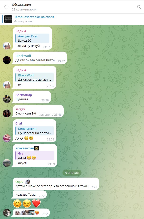 Автор ТемаБест не приводит подробную статистику своих сигналов. Но в канале иногда публикуются отчеты о том, как отработал прошлый прогноз. Кроме этого, подписчики могут отследить проходимость по скринам пари из ленты канала.