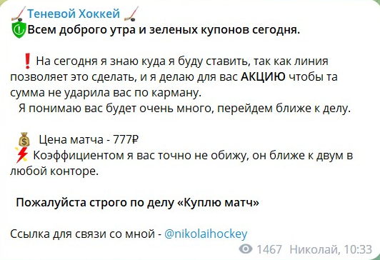 Сразу начну с качества бесплатного контента, который прогнозист Nikolaihockey постит в свой Телеграм. Их основная проблема заключается в отсутствии аналитики. Капер иногда сопровождает предикты несколько предложениями, но обычно они не касаются разбора матча. В таких условиях у пользователей ТГ нет никаких гарантий компетентности админа.