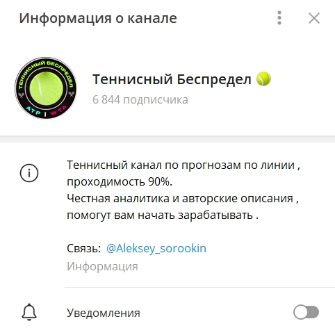 Теннисный беспредел – это Телеграм-канал, на котором каппер Алексей Сорокин публикует прогнозы на теннисные матчи. Связаться с ним пользователи могут в ЛС @Aleksey_sorookin. В ленте канала не обнаружено явной рекламы букмекерских контор. Это можно считать плюсом. С сомнительными проектами аналитик не сотрудничает. Мы провели тщательный анализ и выяснили, стоит ли доверять этому ресурсу.