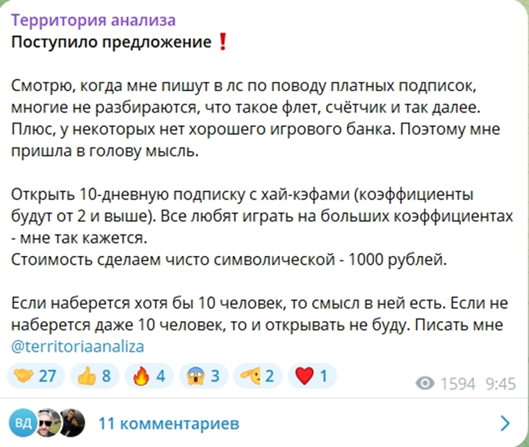 В ленте также нашлись упоминания наборе группы пользователей на счетчик. В рамках данного варианта сотрудничества каппер @territoriaanaliza будет предоставлять советы по ставкам на футбольные матчи до тех пор, пока беттеры не получат прибавку к депозиту в виде 5 флетов. Такой вариант сотрудничества с нашим сегодняшним героем выглядит менее привлекательным. По данным из верификатора, увеличения банка на 15 флетов автор смог достичь в течение 9 месяцев. Неизвестно какой период времени необходим прогнозисту для выполнения заявленных условий по услуге. Других способов монетизации проекта не предусмотрено. Аналитик не сотрудничает с букмекерскими конторами и не рекламирует мошенников.