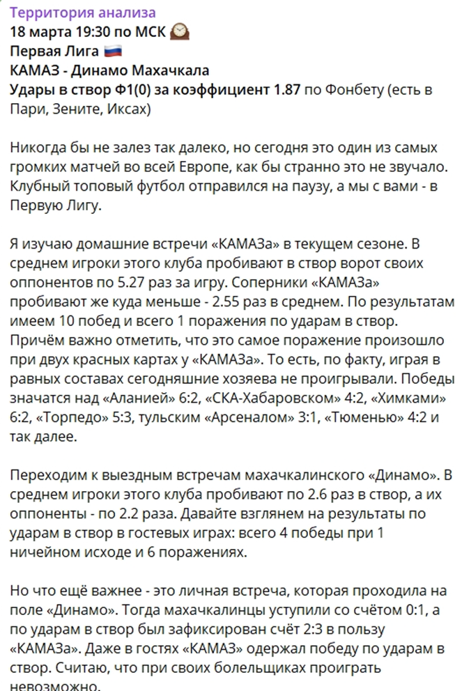 Бесплатные ставки в телеграмм-канале «Территория анализа» представлены ординарами с коэффициентами до 1.9. Примерно 75 процентов предиктов делаются на биг маркеты. Оставшаяся четверть прогнозов остается на смол маркеты. В публикациях с бесплатными советами по заключению пари на футбол присутствует развернутое описание от автора. Он приводит аргументы в пользу своего выбора и ссылается на статистические данные при анализе событий в матче между футбольными клубами. У платных предиктов котировки превышают отметку в 2.0.