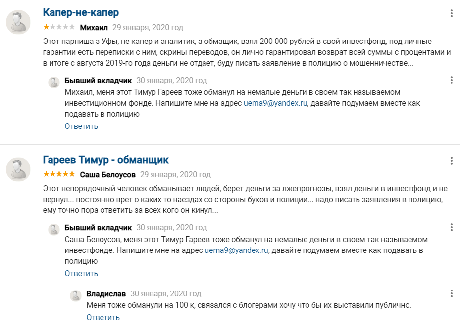 После проведенной проверки удалось установить следующее. Капер Тимур Гареев работал по сомнительной схеме. Он действительно публиковал бесплатные прогнозы, но не верифицировал их. Основная часть жалоб связана с тем, что он не возвращал деньги, переданные ему для якобы инвестирования.