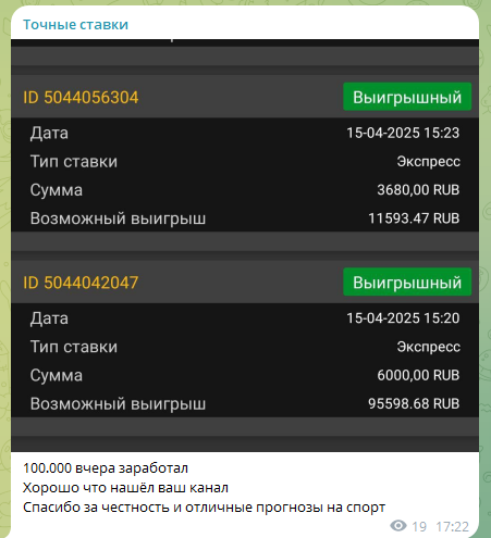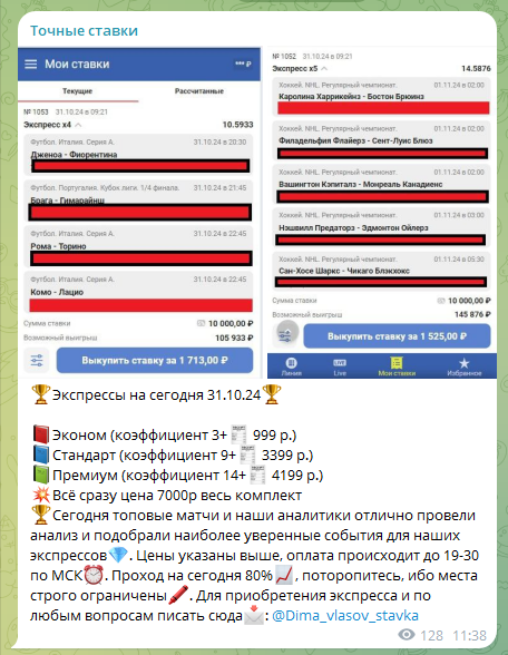 Если говорить о наполнении каналов, то в них выкладывается информация о продаже ставок, которые можно приобрести, написав в личные сообщения Дмитрию. Подтверждений своей статистики автор не дает, при этом иногда предоставляет скрины, где его благодарят за прогнозы. Проверить подлинность сообщений не представляется возможным.