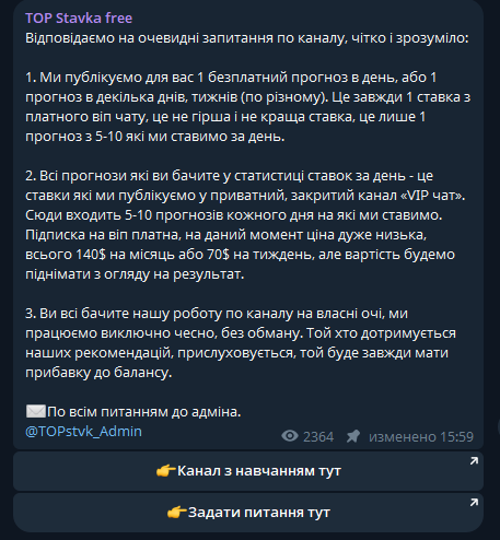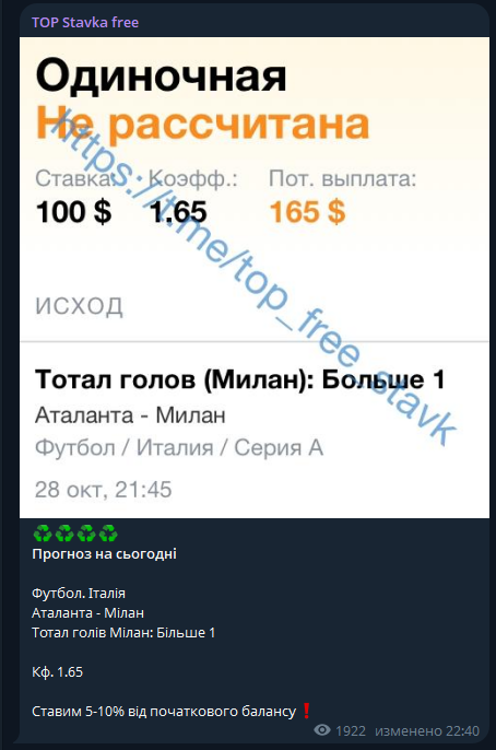 Не рекомендуем канал TOP Stavka free из-за высокой вероятности слива банка. На развод указывают: