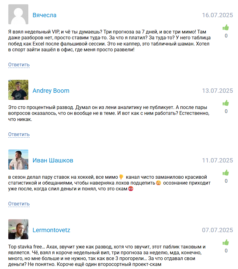 TOPstvk Admin не размещает положительных отзывов или комментариев довольных беттеров. На сторонних сайтах есть много разоблачений проекта и жалобы реальных пользователей.