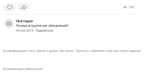 Отдельного вип-чата в telegram не найдено, схемы мошенничества (как раскрутка счета клиента или другие) не применяются, да и рекламы букмекерских контор не встречено — паблик совсем не монетизировал свою деятельность, может от этого и прекратил существование.