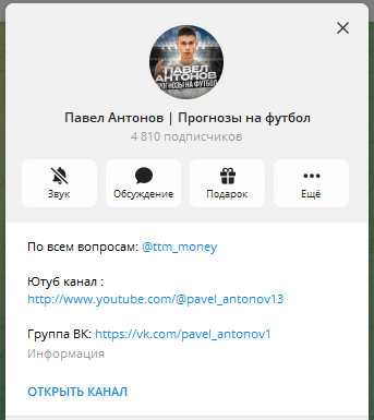 Тг-канал Павла Антонова — всего лишь ресурс для рекламы бк плюс публикации ссылок на основной ресурс в ютуб. Для опытных беттеров автор не даст новой информации, а сам он доход на ставках делать собирается лишь отчасти. Его приоритет — количество прогнозов, а не качество.