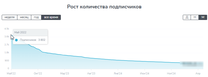 График роста количества подписчиков доступен для ознакомления. В 2022 году аудитория проекта насчитывала почти 4 тысячи человек. Однако впоследствии подписчики начали уходить от аналитика.