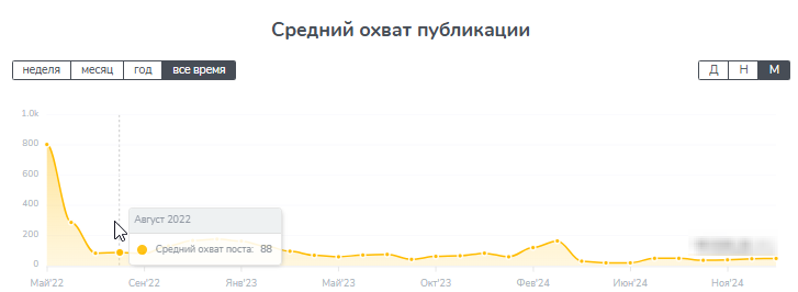 За исключением некоторых скачков, охваты публикаций были на низком уровне. Подобное указывает на использование накрутки. Аналитик прибегал к помощи сервисов нечестного продвижения.