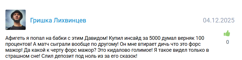 В самом канале отзывы отсутствуют, но в сети много негативных комментариев и жалоб на каппера Давида Валеева. Клиенты подробно освещают схему мошенничества, демонстрируя переписки, в которых прогнозист обещает прибыль.