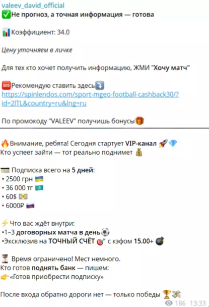 Valeev David Official — телеграмм-проект от каппера Давида Валеева (david valeev93) — это ресурс, известный продажей инсайдов на «договорняки». Проверка показала, что проект продолжает использовать старую схему мошенничества, обещая гарантии дохода и высокую прибыль. Доверие к этому прогнозисту отсутствует.
