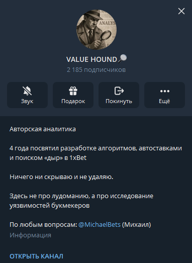 ТГК VALUE HOUND позиционируется, как ресурс с авторской аналитикой. Капер заявляет об использовании автоставок, ошибок БК и собственных алгоритмов. Судя по отчетности в ленте, его подход к беттингу приносит плюс по прибыли на дистанции. Ниже рассмотрим, действительно ли контент проекта приносит доход от ставок.
