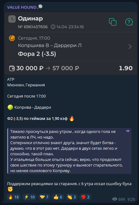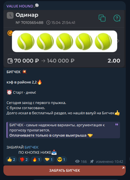 Бесплатный контент представлен ставками по линии на матчи большого тенниса. Капер предлагает ординары и экспрессы, делится примерами своих купонов, размещает анализ события. Коэффициенты — ниже 2.0. Игровых рекомендаций о стратегиях, системах управления банком нет.