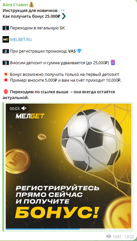 В ленте постоянно появляются записи с призывами получить бонус к пополнению или фрибет у определенного букмекера. Аналитик @VasyaBetKing решил дополнительно получить прибыль за приглашение новых пользователей в контору. Вот только в качестве оплаты за рекламу автору полагается часть от проигранных аудиторией денег. То есть прогнозист вполне может осознанно публиковать в открытом доступе и продавать заведомо некачественные ставки.