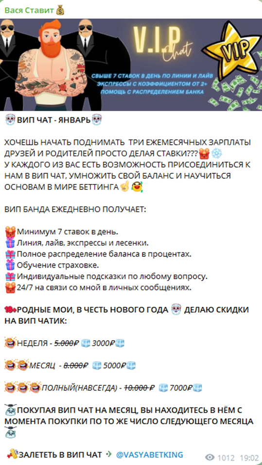 В проекте предусмотрено сразу несколько платных услуг. Одна из них представлена подпиской на вип-чат. Получить к ней доступ на неделю можно за 3 000 рублей, на месяц за 5 000 рублей и навсегда за 7 000 рублей. Данные расценки указаны с учетом скидки. Участники вип-чата будут получать каждый день по 7 предиктов. Клиентов также ждут ставки по линии, пари в лайве, экспрессы и марафоны. Беттерам будут помогать с распределением банка и отвечать на все вопросы касаемо прогнозов. Конкретная информация о сотрудничестве в анонсе отсутствует. Автор не указал коэффициенты и не дал никаких гарантий, не рассказал о путях решения спорных ситуациях и порядке действий при уходе в минус по итогам использования подписки.