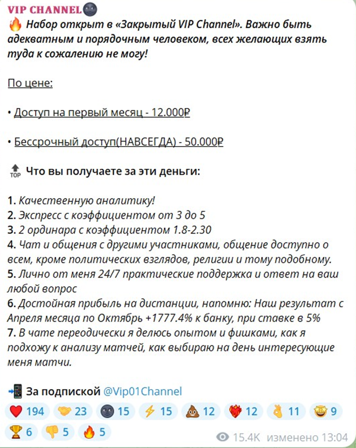 Для всех желающих получать дополнительные советы по ставкам на хоккейные матчи автор предусмотрел вариант с вип-чатом. Получить к нему доступ навсегда можно за 50 000 рублей, а использование платных предиктов в течение месяца обойдется в 12 000 рублей. Всем заплатившим за услугу деньги людям каппер @Vip01Channel обещает предоставлять качественную аналитику по предстоящим встречам хоккейных клубов, поддерживать и отвечать на любые вопросы по пари, показывать свои наработки по анализу матчей и дать доступ к чату для общения с другими клиентами. Также беттеров ждут пара ординаров с котировками 1.8-2.3 и экспресс с коэффициентом от 3 до 5. Будут ли участники вип-чата получать обещанные ставки с указанными котировками каждый день неизвестно.