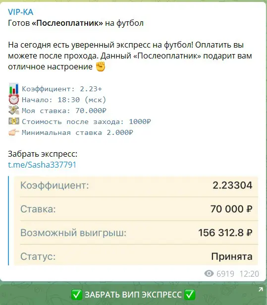 Цена на прогнозы в Телеграм канале Vip Ka