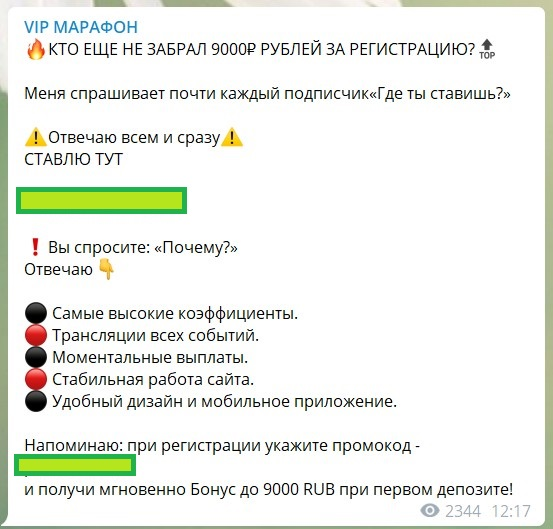Дополнительно в ленте VIP Марафон размещаются рекламные материалы других Telegram-каналов, где продвигаются откровенно мошеннические услуги: договорные матчи, 100% инсайды, раскрутка счетов. Все это указывает на том, что прогнозисту не важен заработок игроков. Его цель – получить максимум прибыли.