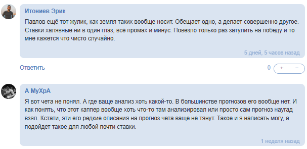 Комментарии внутри Telegram-канала ограничены, полноценный отзыв оставить нельзя. На сторонних ресурсах встречаются негативные мнения о работе прогнозиста и обвинения в разводе. Репутация среди пользователей далека от положительной.
