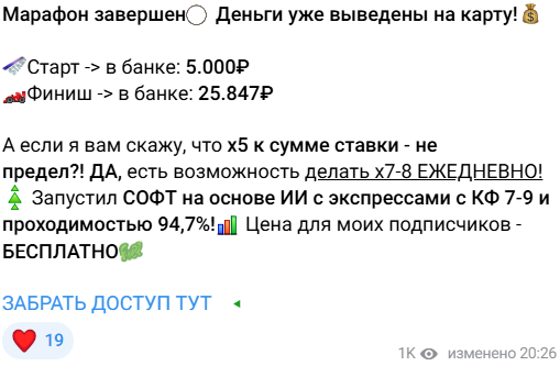 В контенте присутствуют бесплатные ставки на матчи, чаще с невысокими коэффициентами. Иногда публикуются скрины купонов из букмекерской конторы. Аналитика по линии БК и стратегия управления банком раскрываются поверхностно. Акцент делается на экспрессах и лесенках, где обещается быстрый рост банка.