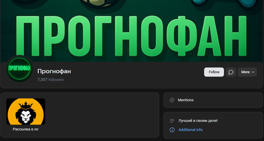 Сообщество ВК ПРОГНОМАН запущено в июне 2023 года. Контент построен на «договорных матчах» — все прогнозисты внутри группы ВК анонимны. Подписчиков более 7 тысяч, однако активность накручена: много лайков и минимум просмотров. Контент состоит из платных экспрессов с коэффициентами 3.0–5.0 и бесплатных прогнозов без анализа и отчетов.