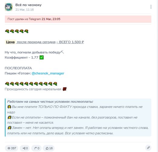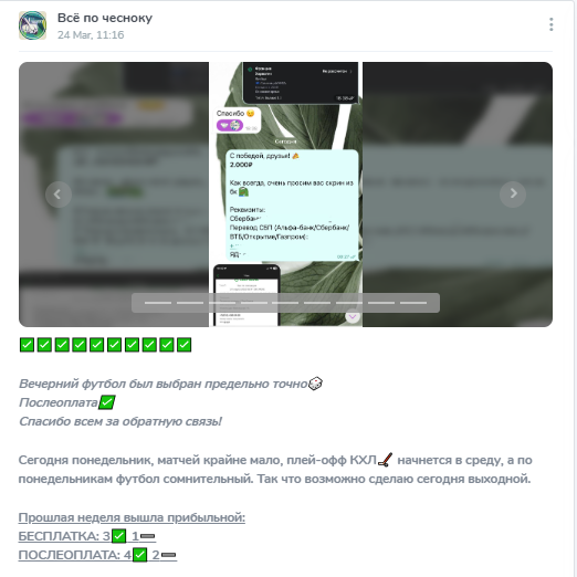 Аналитик ТГ канала и Vk Все по Чесноку публикует бесплатные ставки на спортивные матчи. Игроки могут проверить способности аналитика, но стоит это делать с осторожностью, поскольку прогнозист будет настаивать на регистрации и пари в партнерской БК, значит и бесплатные прогнозы могут быть убыточными для клиента и прибыльными для мошенника.