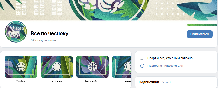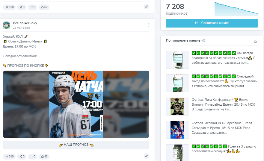 Есть отдельный канал со ставками в live режиме на футбол, хоккей, теннис, баскетбол. Также прогнозист ведет сообщество во ВКонтакте, контент повторяется с ТГК, аудитория состоит из фейков.