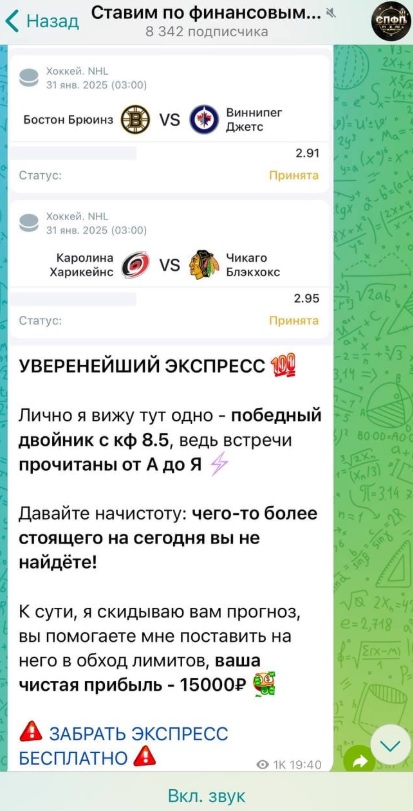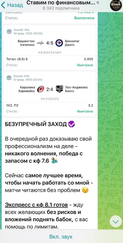 Вячеслав Павлов — капперский проект в Телеграмм, который также имеет название Ставим по финансовым потокам. Он предлагает прогнозы на спорт, преимущественно на хоккейные матчи лиги НХЛ. Прогнозист использует в работе свои схемы — ищет матчи, на которые поставили большие суммы, и применяет эту информацию для себя и своих подписчиков. Наша команда запустила проверку этого блога, чтобы выяснить плюсы и минусы. В разоблачении рассказываем, является ли проект надежным.