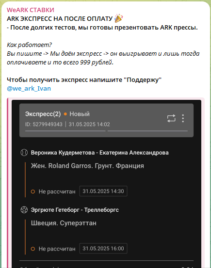 WeARK Ставки — проект telegram с аудиторией семь тысяч подписчиков. Там можно встретить прогнозы на различные виды спорта. Какая проходимость ставок канала и предлагаются ли на нем платные услуги? Произведем проверку.