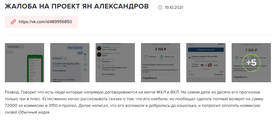 Отзывов на Яна Александрова мало в сети, но мы нашли жалобу, в которой подробно описан развод автора. Игрок бк имел доверие к каперу и переводил ему средства как за инсайд, так и дальше за комиссию.