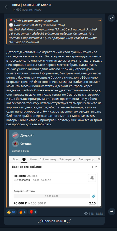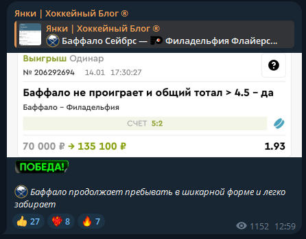 Телеграм-канал Янки Хоккейный Блог: отзывы беттеров и реальная проходимость прогнозов капера Yankee_Lucky