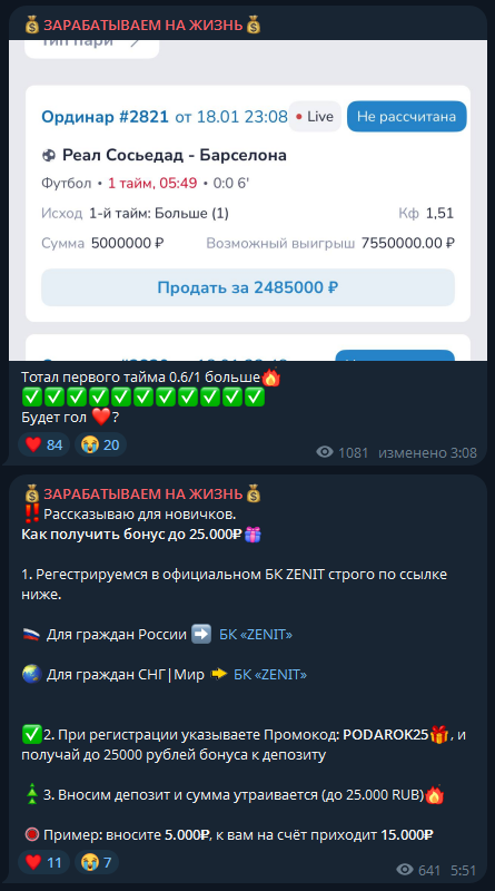 «Зарабатываем на жизнь» — сомнительный телеграм-ресурс. Прогнозы не обеспечивают стабильный доход, а сотрудничество с этим каппером несет высокий риск слива банка и финансовых потерь.