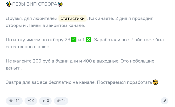 Канал работает с февраля 2024 года и насчитывает более 1 300 подписчиков. Основной контент — бесплатные прогнозы, ординары и экспрессы с коэффициентами 1.7–1.9, иногда советы по ставкам. Автор публикует скрины ставок, но аналитика поверхностная, а статистика проходимости не проверяется.