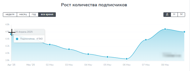 В базы данных сервисов для мониторинга проект попал только в конце апреля. К этому моменту на канале уже было больше 4 тысяч подписчиков. На графике заметно, что к маю аудитория сильно сократилась. Дальше канал опять набрал подписчиков.