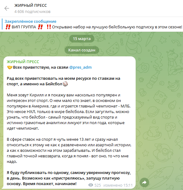 Жирный пресс — канал в Telegram, посвященный разбору бейсбольных событий. Проект был создан якобы опытным спортивным аналитиком. Капер заявляет, что предоставляет ставки с высокой проходимостью. На канале он действительно делится прогнозами с аудиторией. Однако у него есть платные услуги и вип-чат. Есть риск, что аналитик использует схему мошенничества и пытается заработать на доверчивых игроках. Мы провели проверку, чтобы убедиться в безопасности проекта. Вы узнаете, какая у телеграмм-канала репутация и стоит ли проявлять к нему доверие.