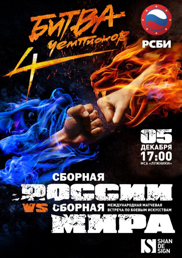 Российский Союз боевых искусств в сотрудничестве со студией SHANDESIGN проведёт четвертую международную матчевую встречу по боевым искусствам «Сборная России – сборная Мира. Битва Чемпионов IV» 5 декабря 2009 года в 17:00 на Малой спортивной арене олимпийского комплекса «Лужники».