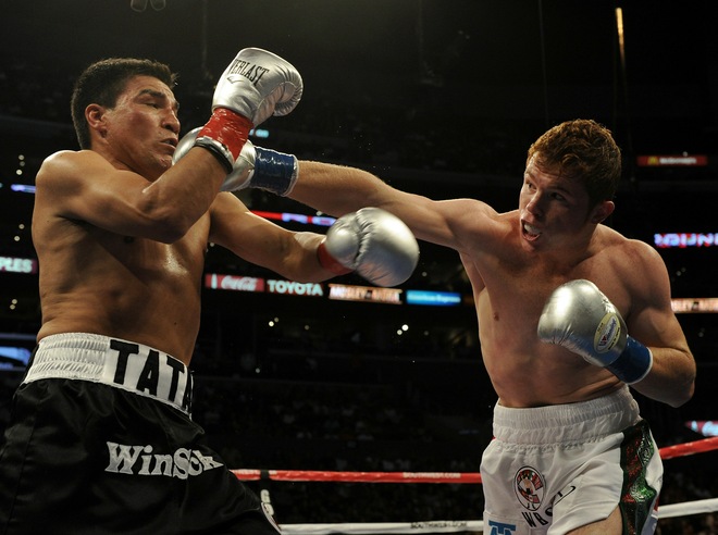 Несколько минут назад в Лос-Анджелесе (штат Калифорния, США) обладатель «серебрянного» пояса WBC в первом среднем весе 20-летний мексиканец Сауль Альварес уверенно защитил принадлежащий ему титул в поединке с бывшим чемпионом мира в полусреднем весе, 39-летним аргентинцем Карлосом Балдомиром. Балдомир с первого раунда пошел вперед, однако Альварес успешно работал на контратаках и имел преимущество. К середине боя превосходство гораздо более молодого и физически сильного мексиканца становилось все более очевидным и на последних секундах шестого раунда, после его левого бокового, Балдомир упал на настил ринга вперед лицом, оказавшись в нокауте. (Фото: Harry How/)