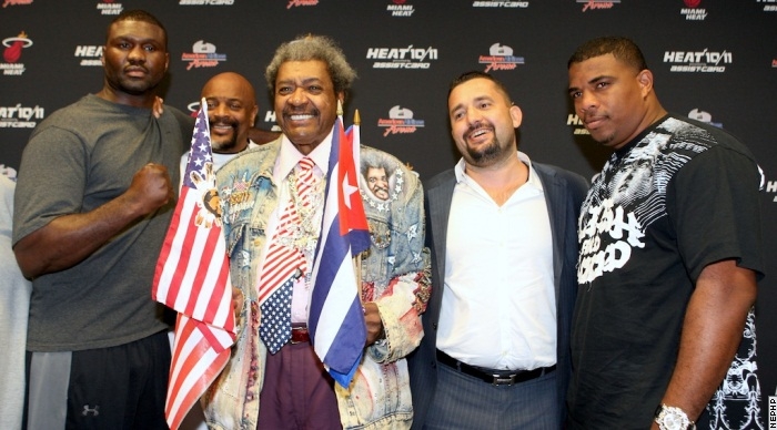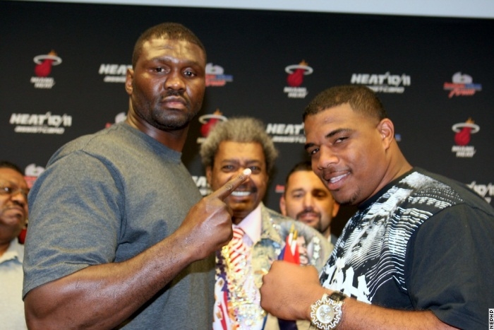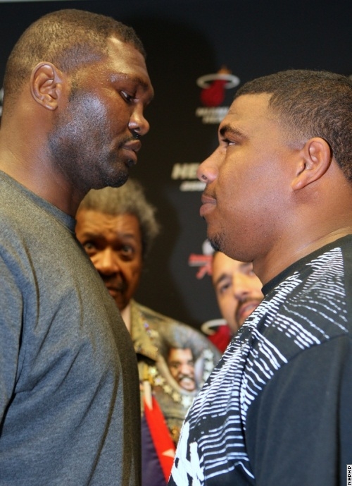39-летний американец Рэй Остин, слева, (#1 WBC) и 30-летний кубинец Одланьер Солис (#2 WBC) позируют фотографам во время пресс-конференции, посвященной официальному анонсу назначенного на 17 декабря боксерского шоу в Майами (США), в рамках которого Солис и Остин проведут отборочный поединок по версии WBC в супертяжелом весе. Победитель этого боя станет обязательным претендентом на титул, принадлежащий сейчас Виталию Кличко. (Фото: Дэвид Мартин Уорр / Don King Production)