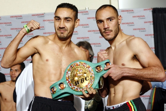Вчера в Анахайме, США прошло взвешивание участников сегодняшнего чемпионского поединка, в котором обладатель титула WBC в легком весе Умберто Сото проведет защиту принадлежащего ему пояса против своего соотечественника из Мексики Урбано Антильона (28(20)-1(1)-0), занимающего 5 место в рейтинге WBC. Чемпион с первой попытки уложился в лимит легкого веса (61,2 кг / 135 фунтов), а претенденту понадобился дополнительный час, чтобы «согнать» лишние 0,2 фунта и показать на весах ровно 61,2 кг. (Фото: Chris Farina/Top Rank/Boxingscene.com)