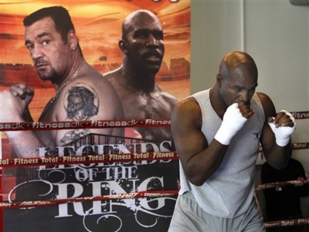 Бывший абсолютный чемпион мира в супертяжелом весе 48-летний американец Эвандер Холифилд (43(28)-10(2)-2) 2 мая в Копенгагене, Дания во время подготовки к поединку против 46-летнего датчанина Брайана Нильсена (64(43)-2(2)-0). Напомним, что поединок Холифилд-Нильсен состоится 7 мая. (Фото: АР)